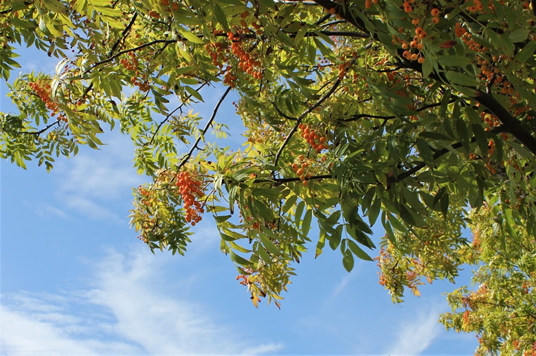 青空に秋の雲を背景にしたナナカマドです。